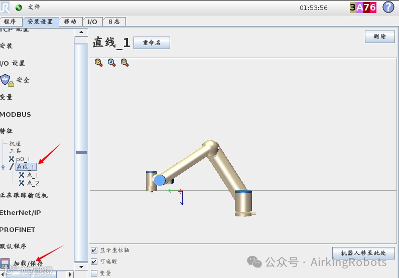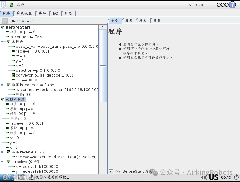 需要说明的是:UR机器人通过DO[1]触发森萨帕特Sensopart智能相机开始连续拍照,相机成功捕捉目标物体,通过网口输出数据,整个工作周期稳定在约120ms。这意味着相机传输给目标线路板物料位置给UR到UR触发皮带线线性跟踪功能时,目标线路板在皮带上沿着皮带线的运动方向已经前进了一个特定的距离偏差,如果皮带速度稳定,那么整个偏差补偿量应该是稳定的。