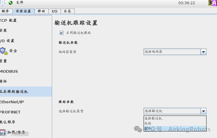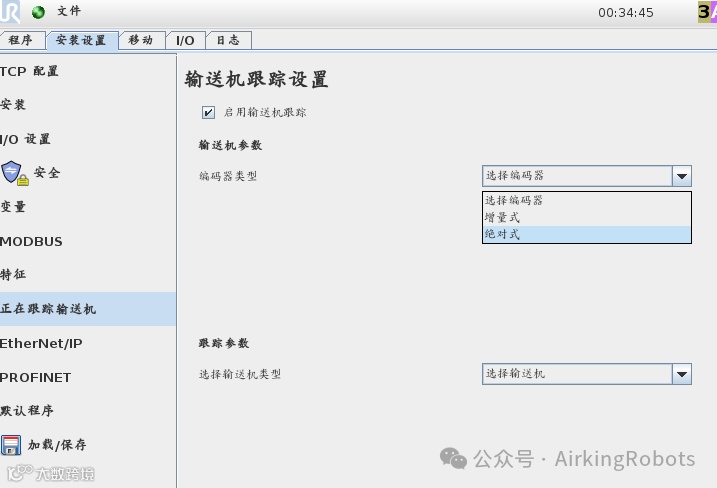 在输送机跟踪设置界面指定编码器类型: