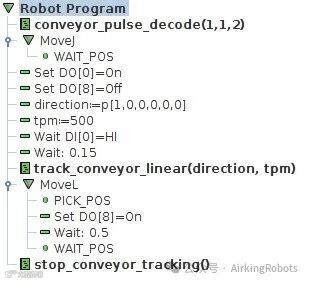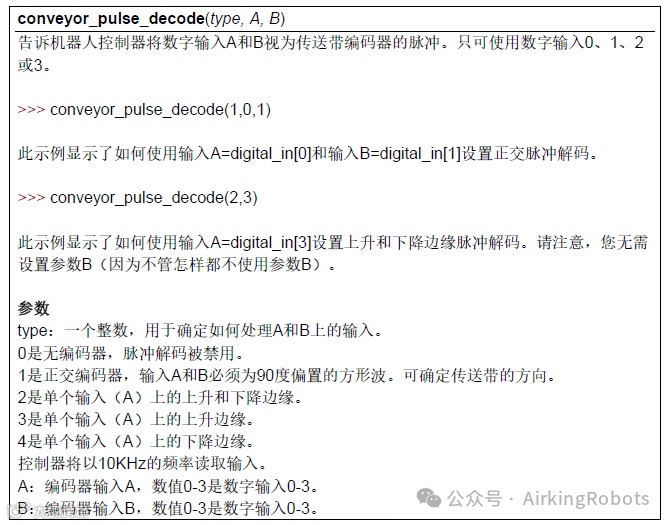 上述方案是基于CB3控制器的设置。如果机器人软件版本低于CB3.2的应用,我们将使用脚本代码conveyor_pulse_decode(type,A,B)。