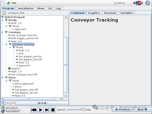 当使用传送带时,机器人可以被配置为跟踪它的运动。程序节点可用于跟踪输送机、输送机跟踪。当安装中定义的输送机跟踪正确配置时,可以跟踪直线或环形输送机。可以从结构选项卡下的向导程序节点中添加节点。当程序在传送跟踪节点下执行时,机器人会自动调整运动来跟随传送带。在跟踪传送带时允许其他动作,但与传送带的运动有关。