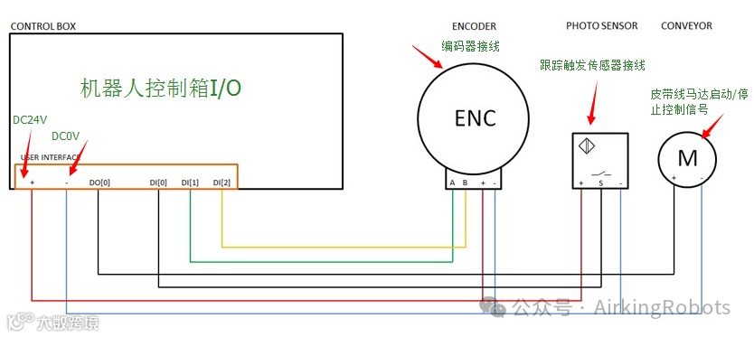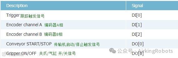 注意:增量式编码器可以连接到数字输入0到3。数字信号解码的运行在40kHz。使用一个正交编码器(需要两个输入),机器人能够根据传送带的方向来确定速度。如果输送机的方向是恒定的,可以使用一个单一的输入,检测是否上升,下降,或上升和下降的边缘,以确定输送机的速度。
