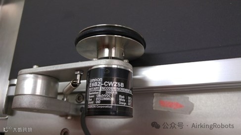 以欧姆龙编码器E6B2-CWZ5B 2000P/R为例。在这个例子中,输送机的方向是单向恒定的,因此使用一个数字输入(DI0)来确定输送机的速度。这个编码器旋转一圈脉冲2000,编码器盘的半径是32.428毫米,直线型输送机的计量单位是每米转数,代入公式:2000 / (2π * 0.032428) = 9816,得到每米的计数是9816。