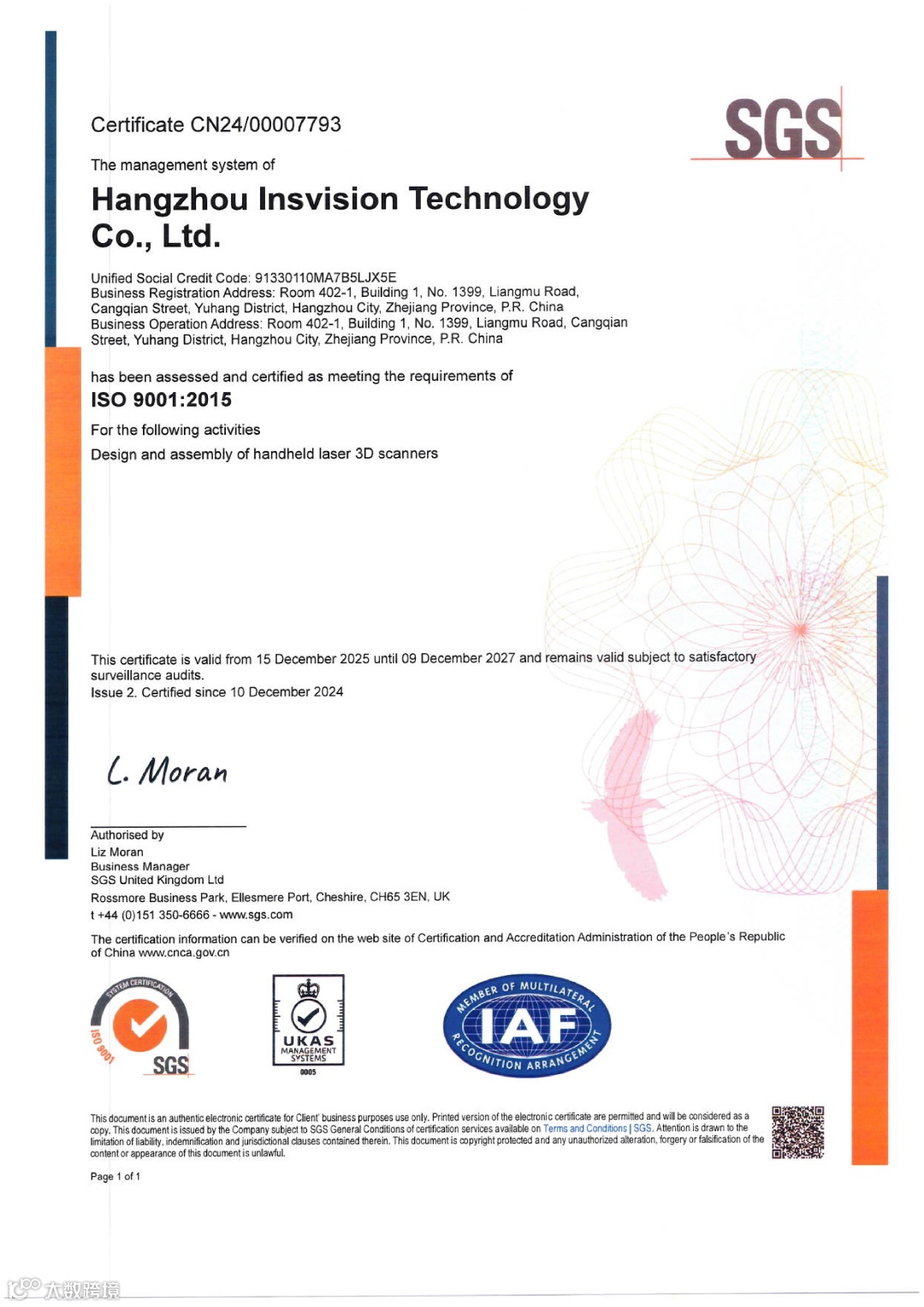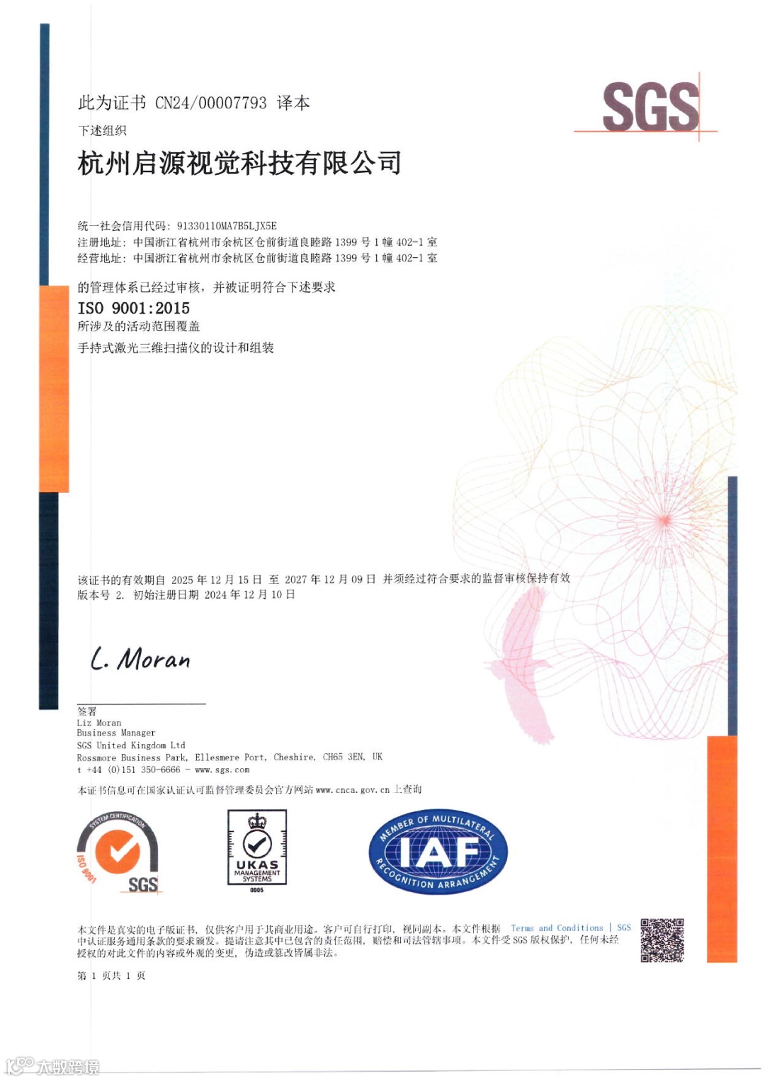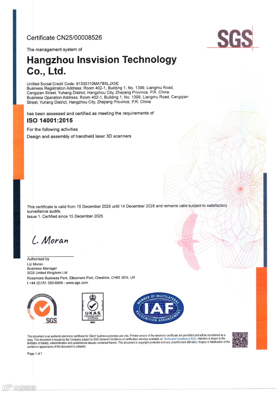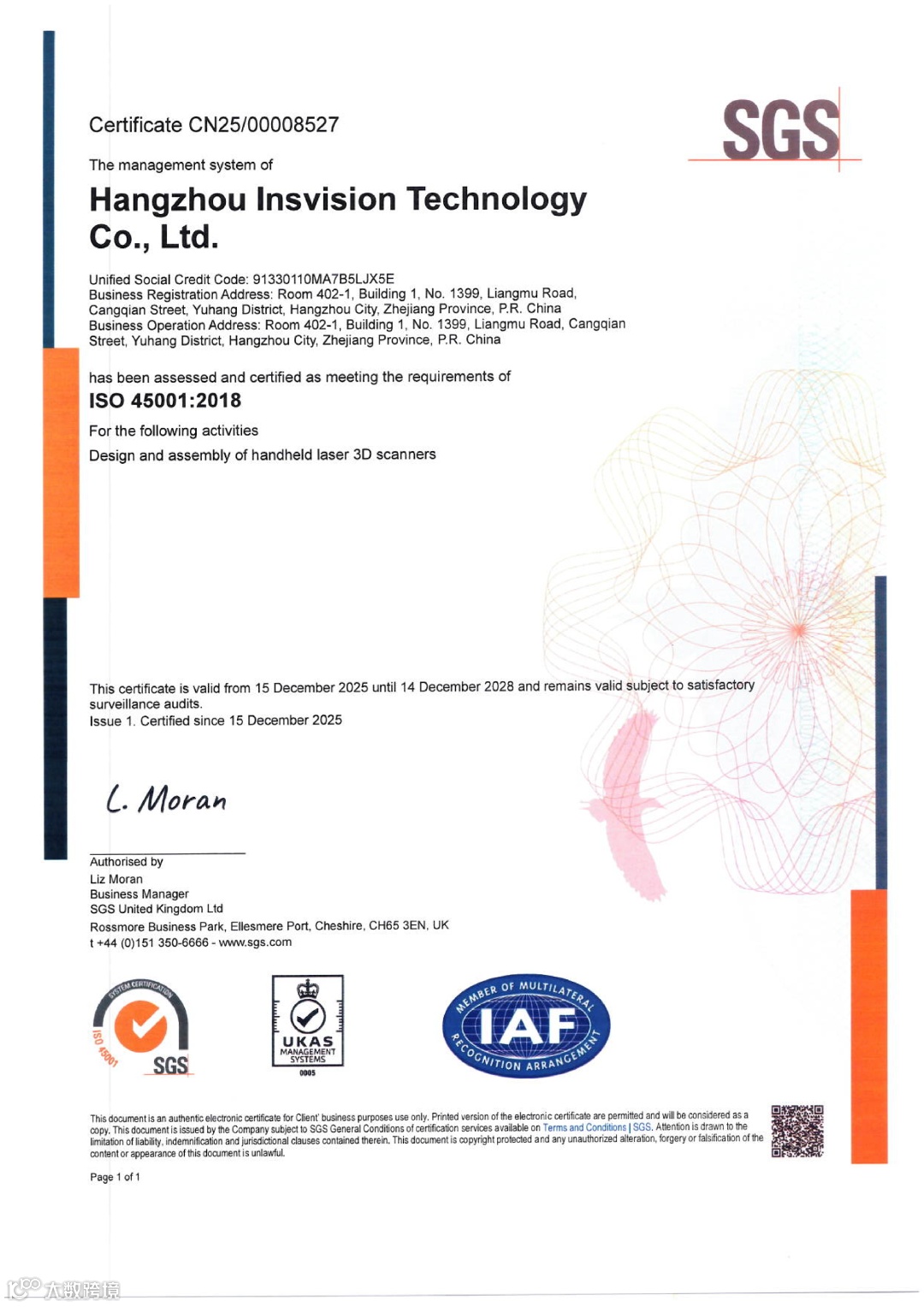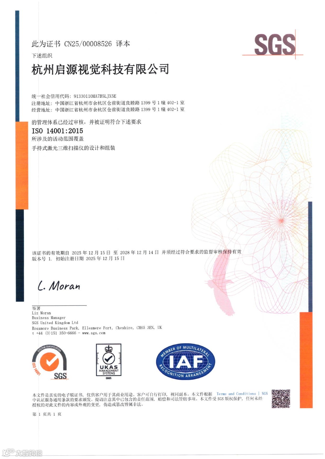 2025年12月,杭州启源视觉科技有限公司成功通过ISO 9001:2015质量管理体系、ISO 14001:2015环境管理体系及ISO 45001:2018职业健康安全管理体系三项国际标准认证,本次认证由国际公认的测试、检验和认证机构SGS(UK)严格审核并颁发,覆盖公司核心业务“手持式激光三维扫描仪的设计和组装”。