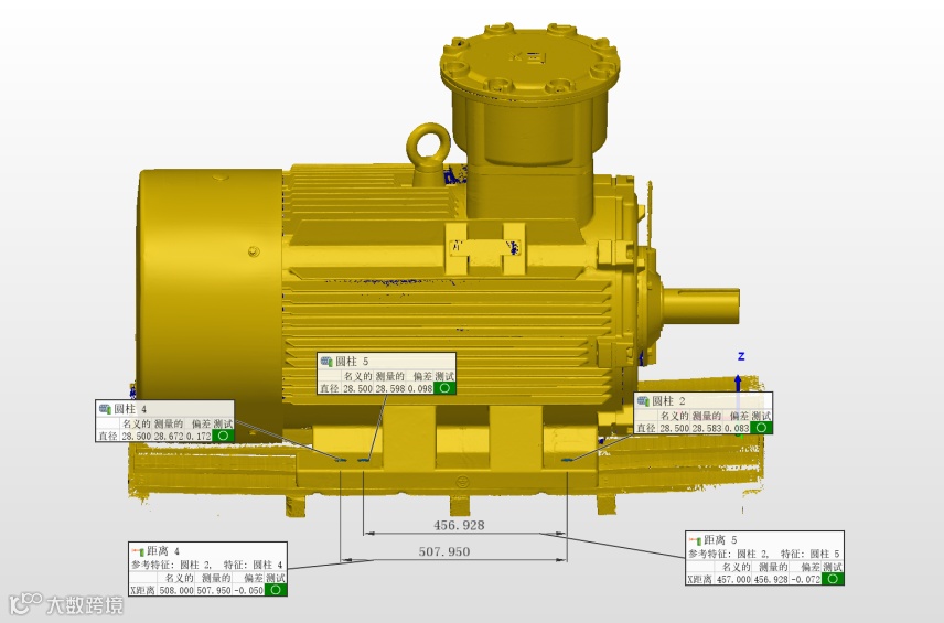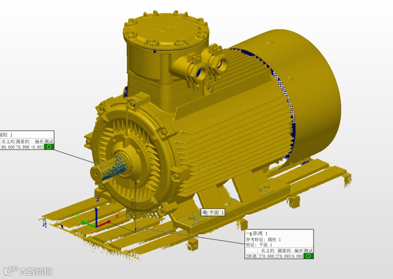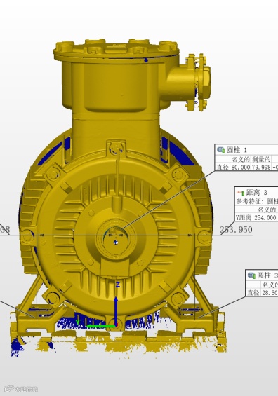 在专业检测软件中,工程师可以直接提取关键的空间配合尺寸,如主轴到安装面的高度、底面的安装孔间距,孔位的空间偏移量,数据直观可靠;可以将原始设计的三维模型与扫描得到的实体数据进行快速比对,精准定位超差区域,问题一目了然;还可以基于扫描获得的精准配合面数据,逆向生成或优化新部件的设计模型,确保从数据源头实现“严丝合缝”。
