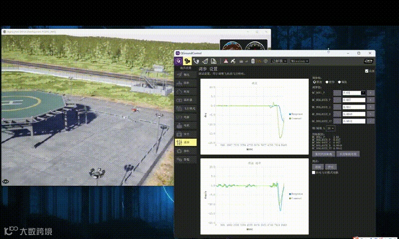 从图中可以看到,QGC界面中的滚转角响应曲线不收敛且剧烈震荡,渲染引擎中的旋翼也在大幅度地往复滚转,在该情况下,需要将MC_ROLL_P值调小。