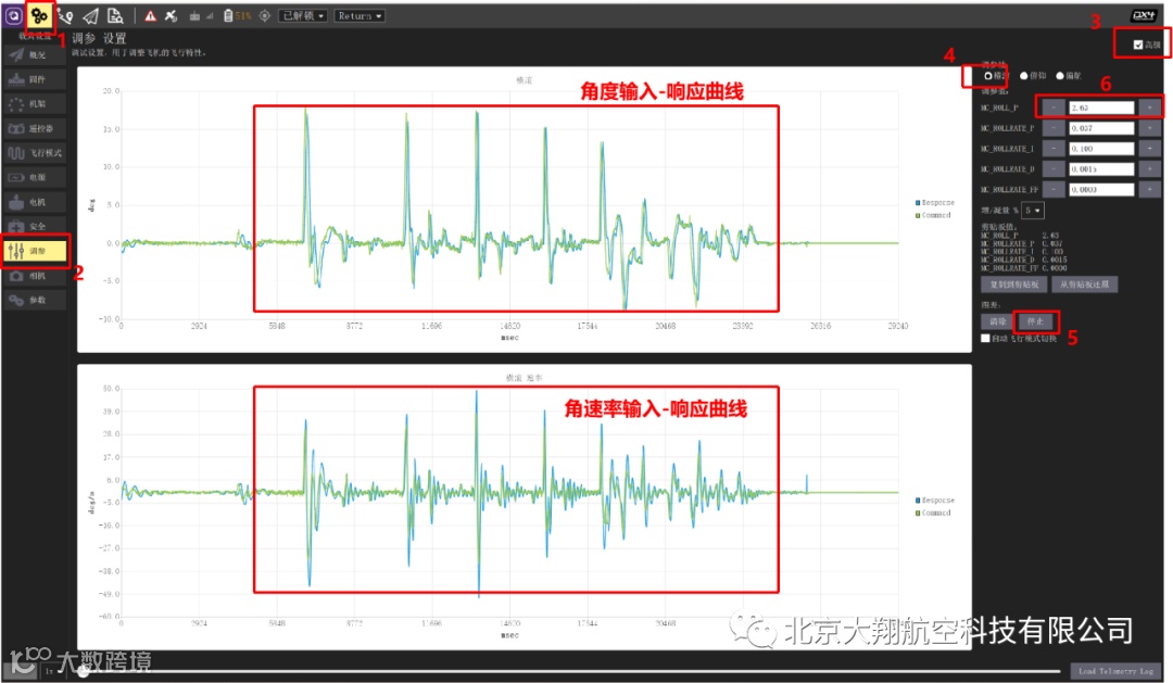 具体操作流程如下:点击上方的齿轮图标->点击左下方“调参”->勾选右上角“高级”->点选通道(如“滚转”)->点击“开始”按钮(绘图开始后变为“停止”),绘制输入-响应曲线->输入新数值或点击“+”或“-”图标调整参数大小。此后,界面中央将实时绘制分别对应该通道角度及角速率的输入-响应曲线,绿色为输入,蓝色为响应。以滚转通道为例,关键参数及其含义如下表所示: