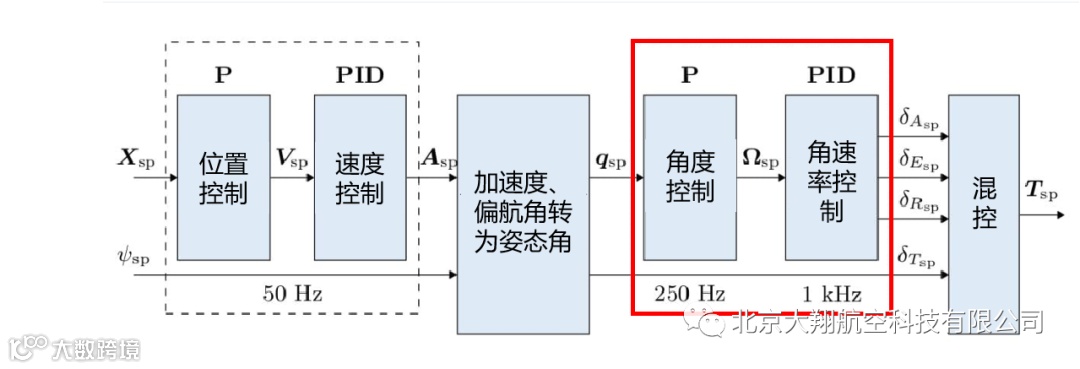 在线调参界面针对的是其姿态控制器(图中标红部分),该控制器分为俯仰、滚转、偏航三个互相独立的通道,每个通道对相应的角度、角速率进行控制,角度控制的输出作为角速率控制的输入。