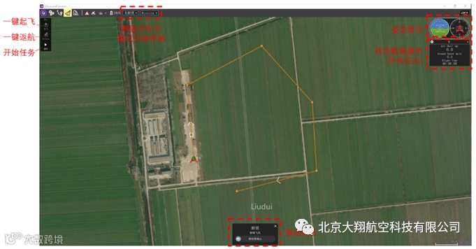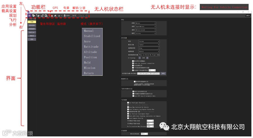 界面左上角的功能栏图标从左到右依次为应用程序设置、载具设置、规划、飞行、分析,下面将依次介绍这几个功能的内容与用途。