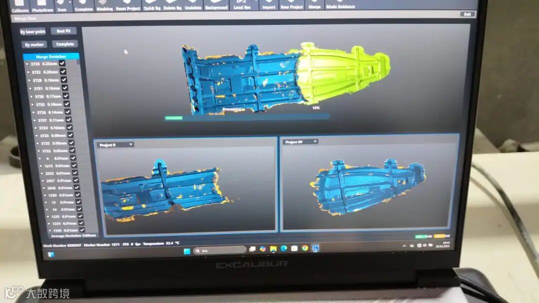 扫描完成后,通过预先布置的公共标记点手动拼接,庞大船体瞬间“合体”,完整、精确的三维模型轻松呈现。单船扫描时间压缩至2小时(含预处理),较传统测量方式提速5倍以上。