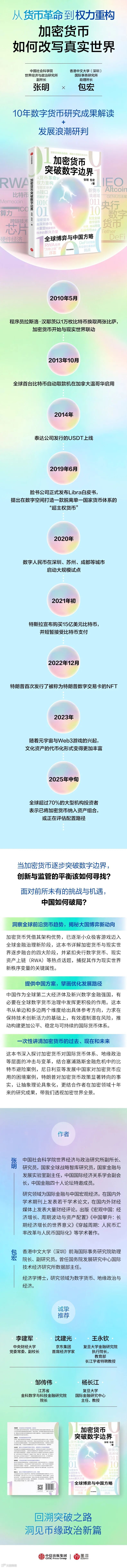 这本书出版后,2024年4月,我到深圳参加由香港中文大学(深圳)前海国际事务研究院主办的“全球经济治理:中国与世界2024研讨会”,偶遇该研究院助理院长包宏博士。他碰巧也在跟踪研究数字货币,而且就这个领域有不少创见。我们决定就数字货币开展新一轮合作研究,相关论文陆续发表于《金融监管研究》《美国研究》《国际经贸探索》等期刊。摆在你眼前的这本《加密货币突破数字边界》,就是我们合作研究的最新成果。