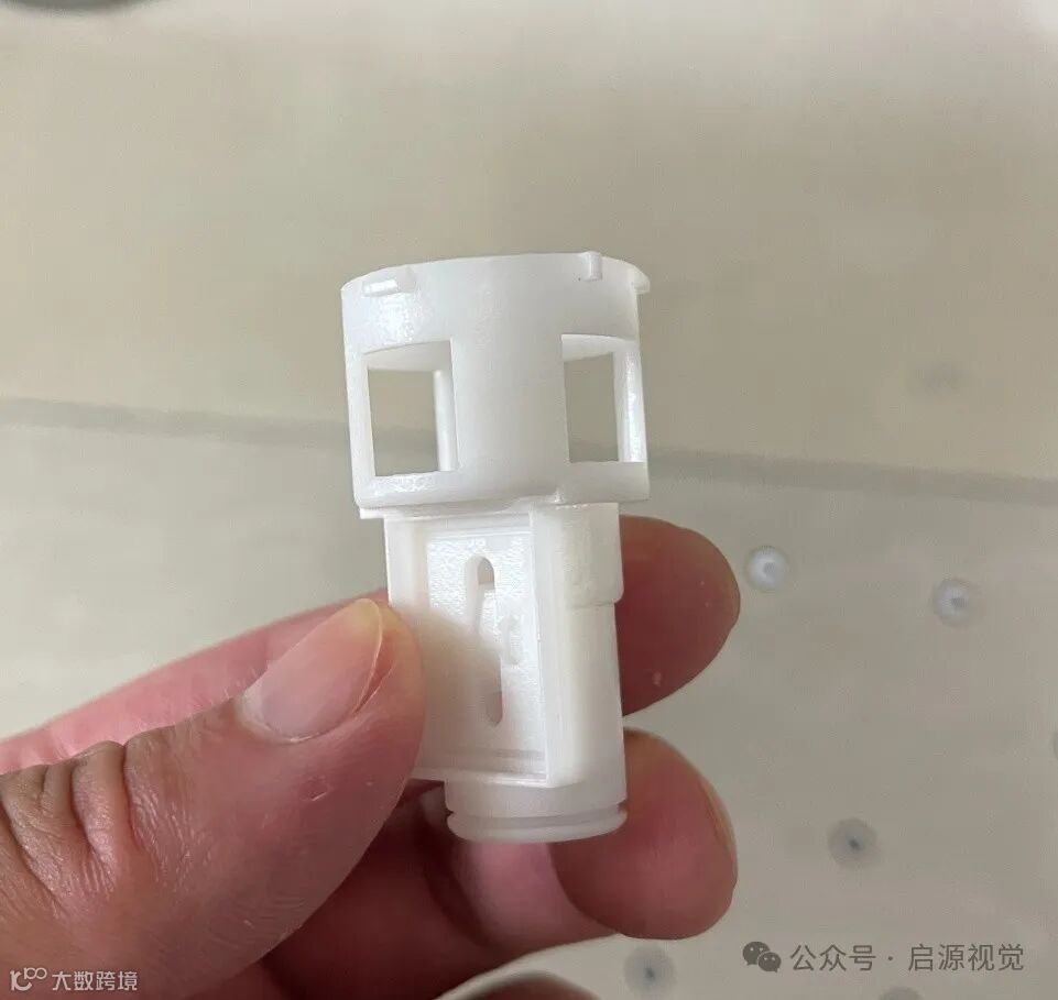 例如客户这次的小物价,是一个只有拇指大小的卡扣一样的东西,材质是白色的胶,细节多。顶端圆孔旁边的突出的小块,中端有凹槽和凹槽内的小孔,底端是更小的椭圆,中间还有一圈凹进去的圆。物体小,细节多,扫描难度极大。