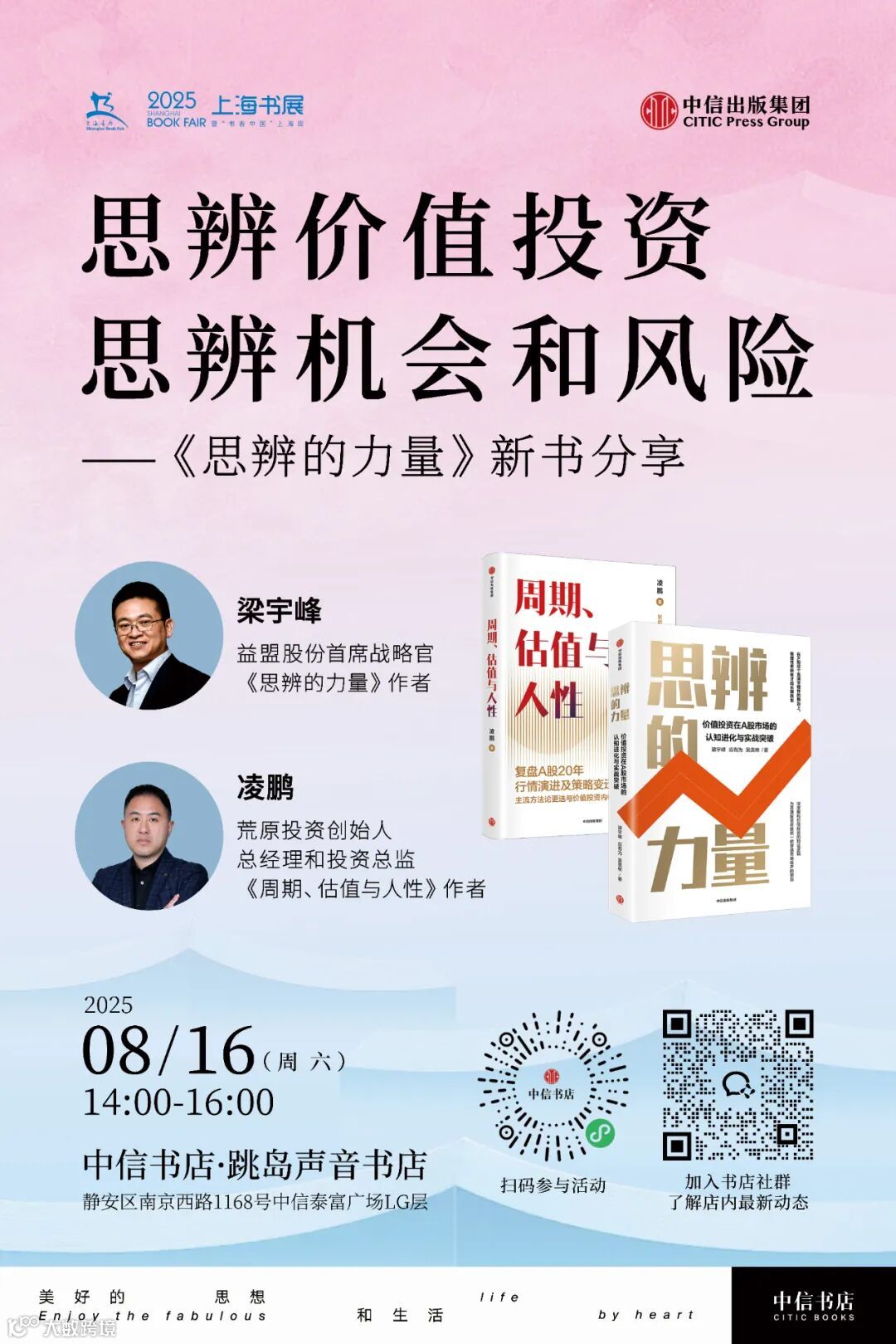 在充满不确定性的市场环境中,如何通过理性思辨识别真正的投资机会?如何规避认知偏差,构建长期稳健的财富策略?《思辨的力量》新书分享会特邀作者梁宇峰与推荐人凌鹏两位资深投资专家,从宏观趋势到微观实践,深入探讨价值投资在A股市场的适用性。届时,两位专家还将围绕“牛市驱动力”“普通投资者财富管理”等核心议题展开对谈,助您打破思维定式,掌握思辨方法论。无论您是专业投资人还是理财爱好者,这都是一场不可错过的思想盛宴。