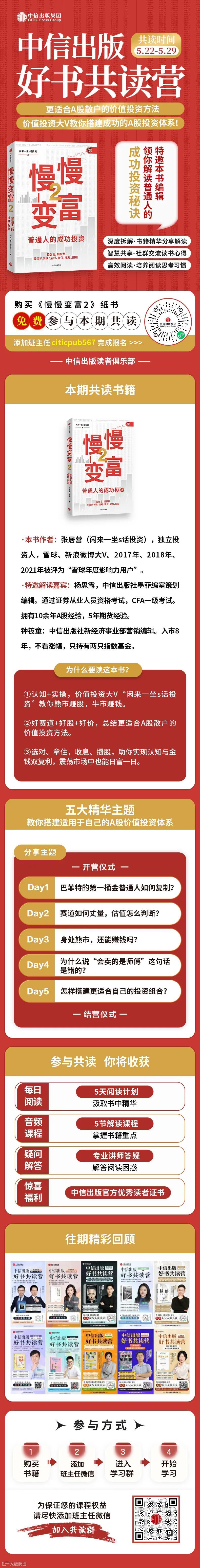 好消息、好消息!5月22日—29日,《慢慢变富2:普通人的成功投资》的编辑将带领大家共读这本书,课程分为五期,信息都在海报上了,购书的粉丝大家不要错过!