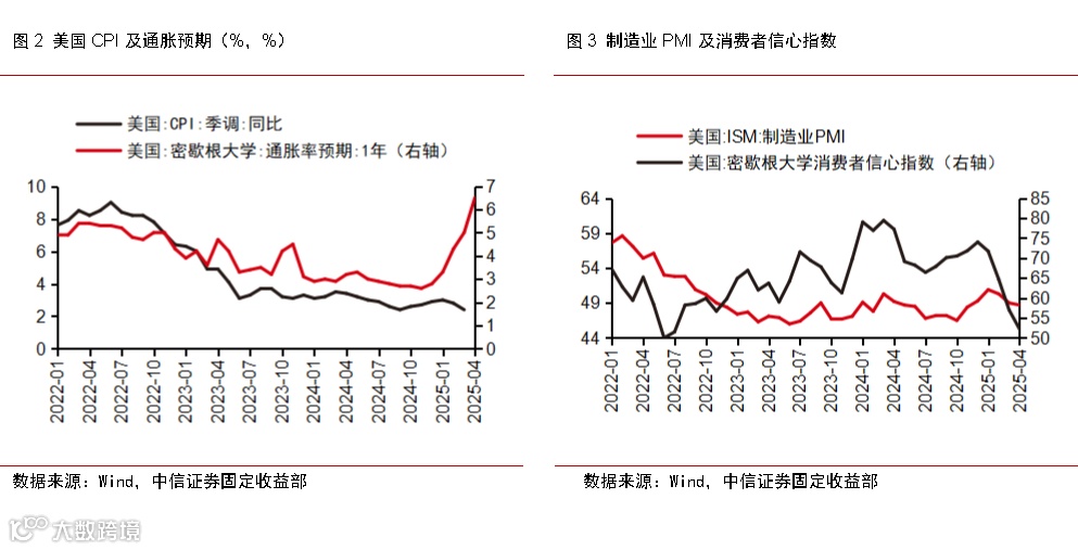 ①对等关税落地后,前瞻指标显示市场对美国经济滞胀风险的担忧明显升温。超预期的对等关税落地之后,市场担忧美国进口价格上涨将可能放大美国面临的短期通胀压力,因此即便近期美国CPI同比增速有所回落,4月密歇根大学1年期通胀预期也大幅上行至1982年来的最高水平。与此同时,在对等关税扰动下美国4月消费者信心指数下行近40年来次低水平,ISM制造业PMI也在收缩区间进一步下降,市场对美国经济滞胀风险的担忧正在不断升温。