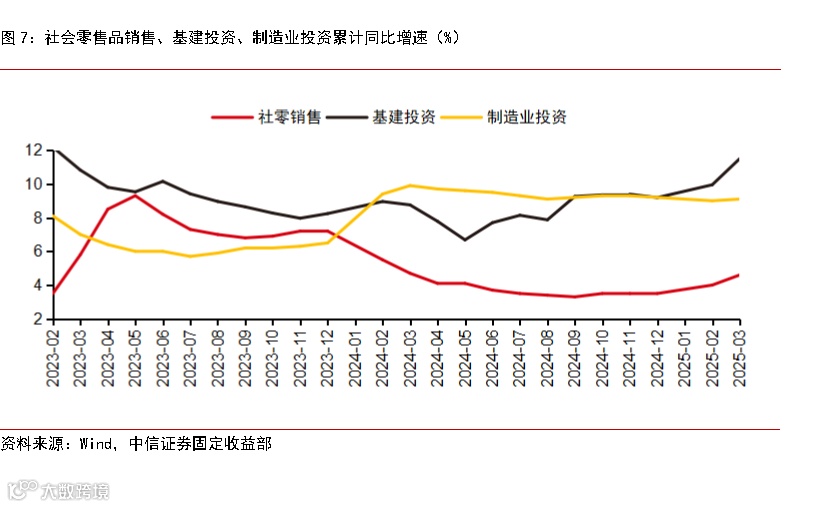 ②年初以来宏观政策持续发力持续显效,为我国面对外部环境冲击提供了更为充足的底气和谈判筹码。今年年初以来以旧换新政策效能持续显现,带动社零销售同比增速延续改善;而在推动“十四五”规划重大工程顺利收官的政策要求下,今年一季度我国财政融资明显提速并驱动基建投资同比增速高位走升;此外,“两新”政策加力扩围、制造业重大技术改造升级扎实推进也带动今年以来的投资维持高速增长区间。总体来看,年初以来宏观政策的持续发力在助力消费回升投资企稳的之余,也对对等关税带来的冲击形成了一定对冲。