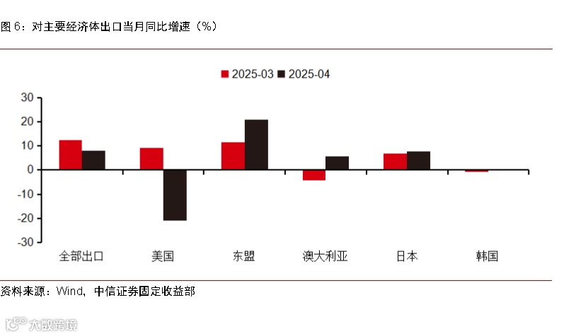 ①在贸易多元化的支撑下,我国出口虽受关税扰动但依旧维持了较高增速。尽管我国4月对美出口金额同比增速由3月的+9.1%大幅走低至4月的-21.0%,对整体出口数据形成了一定负面扰动。然而,4月我国对东盟的出口金额同比大幅增加20.8%,对日本、韩国、澳大利亚等国的出口同比增速也边际提升,贸易多元化趋势在一定程度上对冲了我国对美出口的萎缩,使得4月我国出口同比增速虽较3月小幅下滑,但仍维持在8.1%的近年较高水平,在关税风波中显露了较强韧性。