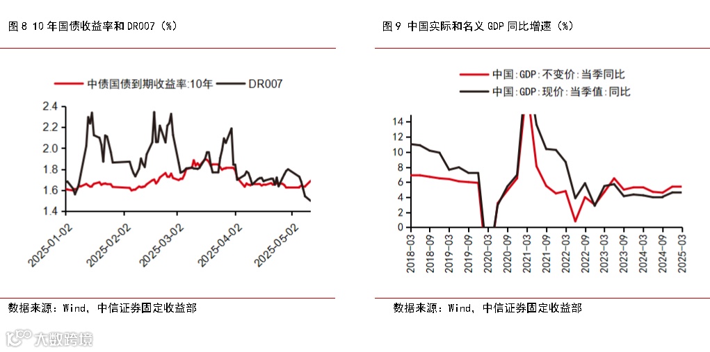 对于国内债市而言,虽然短期内关税缓和后风险情绪明显好转以及“抢出口”逻辑回归或带来调整的压力,但当前国内有效需求不足问题仍待解决、市场对货币宽松仍有预期等因素或有望限制收益率上行幅度。此次中美贸易会谈结果超预期使得市场风险情绪明显改善,导致5月12日中国国债收益率曲线大幅陡峭化上行。短期来看,不论是风险情绪的好转延续,还是在关税暂缓的90天内外贸企业继续把握时机“抢出口”支撑经济数据表现,均可能继续给债市带来一些调整压力。但当前价格指标仍然偏弱的现状或表明国内有效需求不足的问题仍有待解决,市场对进一步降准降息也仍有较强预期,这些因素或有望限制现券收益率的上行幅度。