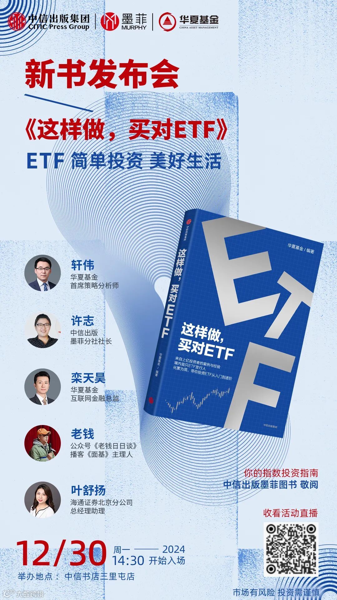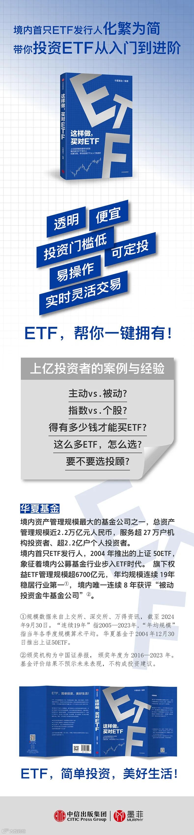 正值ETF20周年之际,如何拥抱ETF大时代?普通人如何参与ETF投资?中信出版与华夏基金策划推出ETF指数投资指南《这样做,买对ETF》,并于2024年12月30日15:00举办新书发布会,与大家一起共同探讨ETF投资机遇,体验全民投资时代的指数投资工具。欢迎预约直播~
