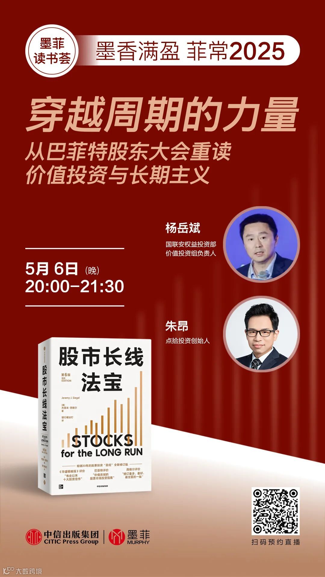 投资是一场长跑,与智者同行,方能行稳致远。5月6日晚20:00,欢迎锁定中信出版·墨菲直播间,收获你的“长线投资法宝”。立即扫码预约,开启你的长期投资之旅!