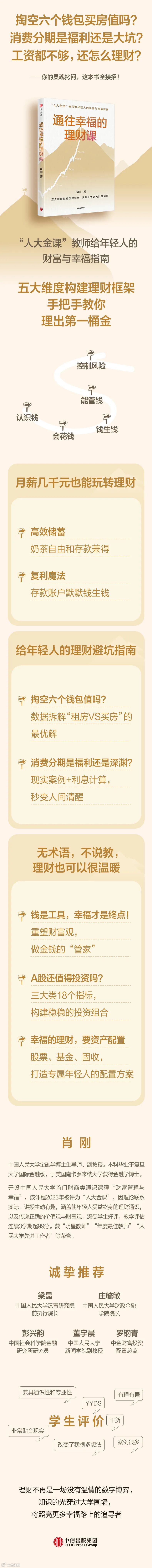 经过多年的思考和钻研,自2021年春季学期开始,我在中国人民大学开设了一门面向全校本科生的财富管理通识课程“财富管理与幸福”。从2021年到2024年,我连续7个学期教授这门课,选课人数也从最初的30人上升到了330人。这是人大历史上首门财富管理通识课程,并在2023年入选了“人大金课”,被列作本科生的通识核心课程。在这门课上,我不仅教学生财富管理方面的知识、技能,也花了很多时间和学生一起讨论财富管理所需要的品格、心态、价值观和财富观。作为老师,每一次讲授这门课,都是对我自己的一个激励,帮助我更深刻地理解财富与人生的意义。因此,我基于这门课程的内容创作了本书,它不仅是一个财富管理通识教育的载体,也代表了我作为一名大学老师,对于帮助更多人,特别是年轻人,通过财富管理获得幸福、成就人生的使命担当。