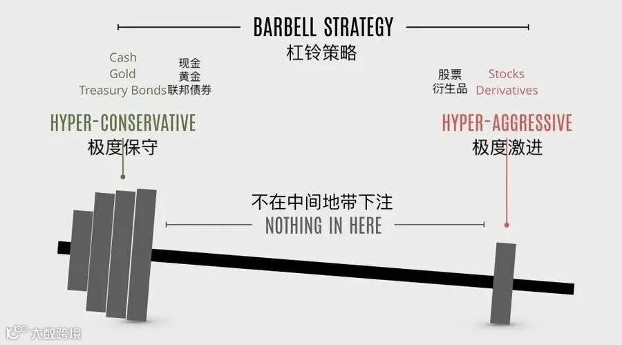 塔勒布推崇杠铃法则——将85%-90%的钱投入极低风险的资产中,比如国债,来享受确定性,剩下的10%-15%投向极具不确定的高风险品种,比如期权,来享受正向黑天鹅带来的收益,完全放弃中等风险的投资品。