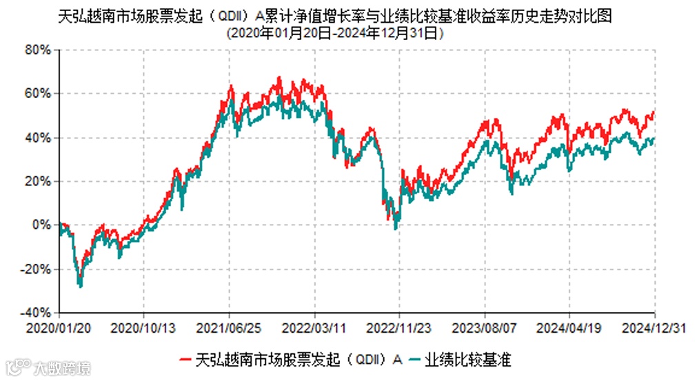 之后,我们可以打开越南基金最新一期的报告(2024年第四季度报告),看看它到底行不行。我们不是想找VN30指数的替代品吗?先看看该业绩的比较基准:越南VN30指数收益率(使用估值汇率折算)×90%+人民币活期存款利率(税后)×10%。这只基金锚定VN30指数,的确是我们要找的。再看看走势图,也算钉得住,甚至比基准表现更好一些。