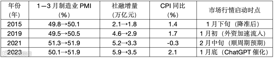 总结来看,当PMI重返扩张区间,市场风险偏好显著提升;当社融超预期,信贷“开门红”时,往往强化经济复苏预期,推动周期股行情;当CPI温和上行,通胀未过热时,政策宽松空间较大,利于成长股估值扩张。