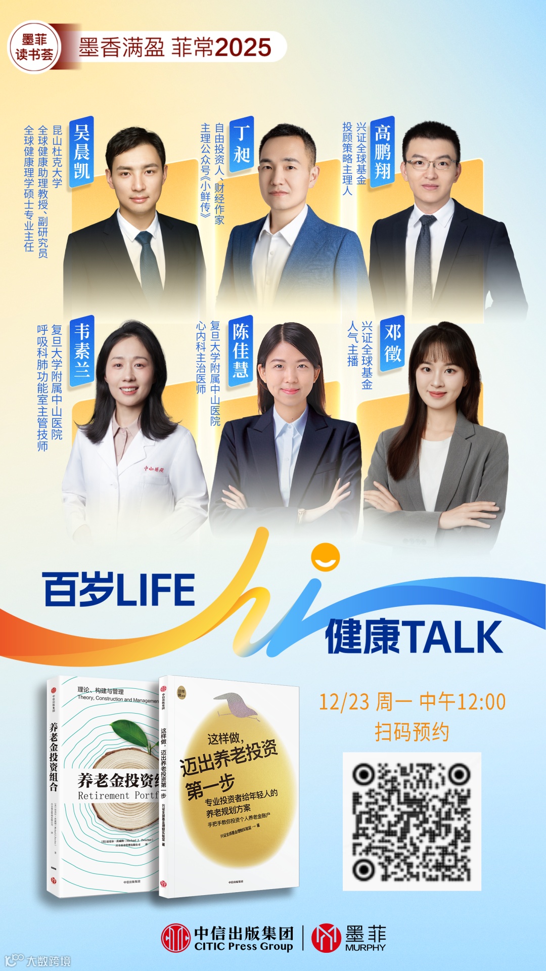 12月23日12:00,兴证全球基金携手中信出版·墨菲举办有「养」生活系列活动,邀请一线医生、高校学者、财经媒体人和投资专家等嘉宾,共同对话并分享各自专业领域的见解。欢迎扫码参与直播~