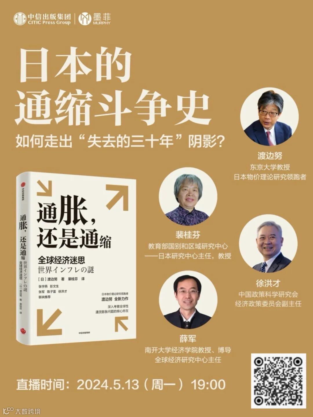 2024年5月13日,作者渡边努将与《通胀,还是通缩:全球经济迷思》的译者裴桂芬、中国政策科学研究会经济政策委员会副主任徐洪才及南开大学经济学院教授薛军进行座谈,共同讨论日本的通缩斗争史,大通胀时代下全球经济的发展走向,为读者了解全球经济大势、把握时代脉络提供重要的参考借鉴。