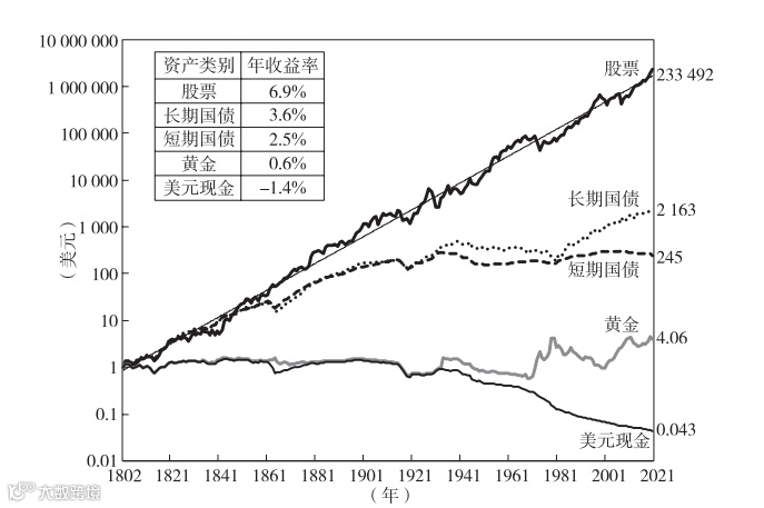 我们经常能在叫人投资理财的书里看见这张图,不过最近的年份只到2002年。这是因为只有在最新版的《股市长线法宝》中,西格尔才将数据扩展到了2021年。图中我们可以看出,股票的收益几乎是以稳定的对数指数增长(纵坐标轴每个刻度间隔101)。如果一个人在1802年有100美元,如果他持有货币,到2021年只能剩下4美元;如果他持有黄金,那么到2021年他手中有406美元;而如果他购买了股票,到2021年他手中有2334万美元,投资股票带来的收益可见一斑。