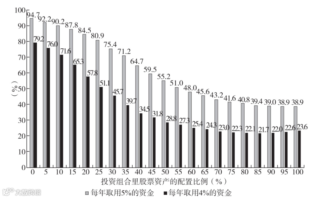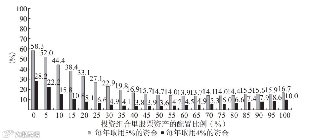 深色的柱状图低于浅色的柱状图,表示每期取用的资金越少越不易破产,这符合我们的一贯认知。而柱状图最低的地方代表破产概率最低的资产组合,是我们感兴趣的内容。从图中可以看出,当每年取用4%的资金时,配置50%的股票变成穷光蛋的概率为3.6%;每年取用5%的资金时,配置65%的股票变成穷光蛋的概率为13.7%。