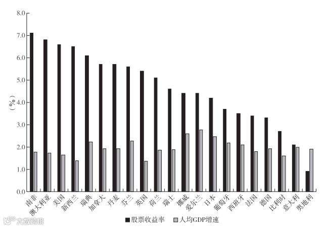 图6 1900—2020年各国股票收益率与人均GDP增速
