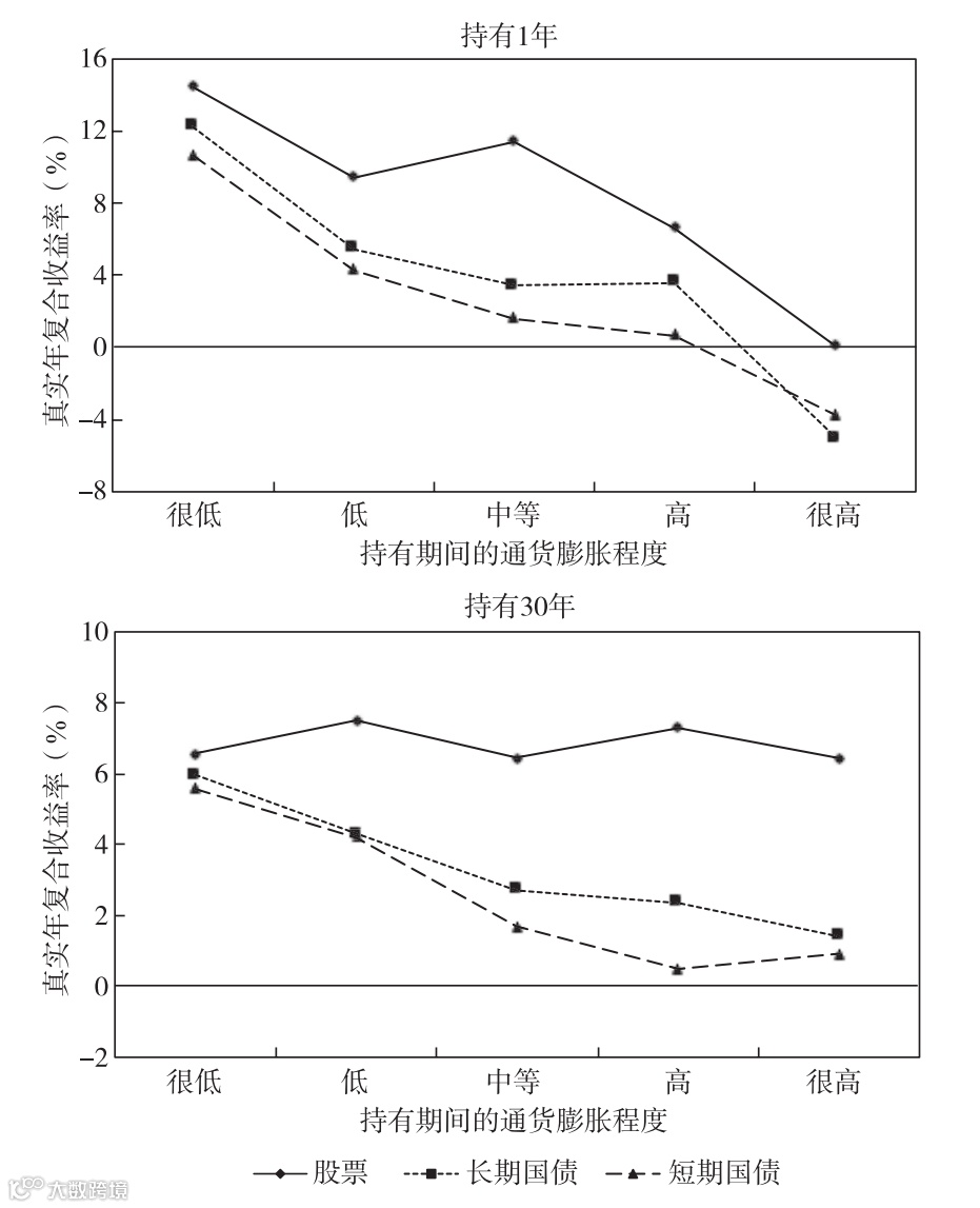 将严重的通货膨胀情形纳入考虑,我们发现,短期恶性通货膨胀下债券的真实收益率是负数,而股票仍能实现资产保值。若恶性通货膨胀持续30年之久,股票将完全对冲通胀率,与低通胀情形保持一致的收益率。西格尔认为,这是因为股票作为一种权益投资,本质上是一种对实物资产盈利的所有权。