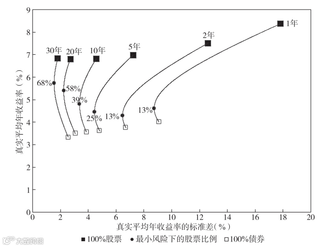 而在股票配置为68%时,虽然破产的概率有所上升,但在30年的期限内能达到风险-收益权衡的最优状态。