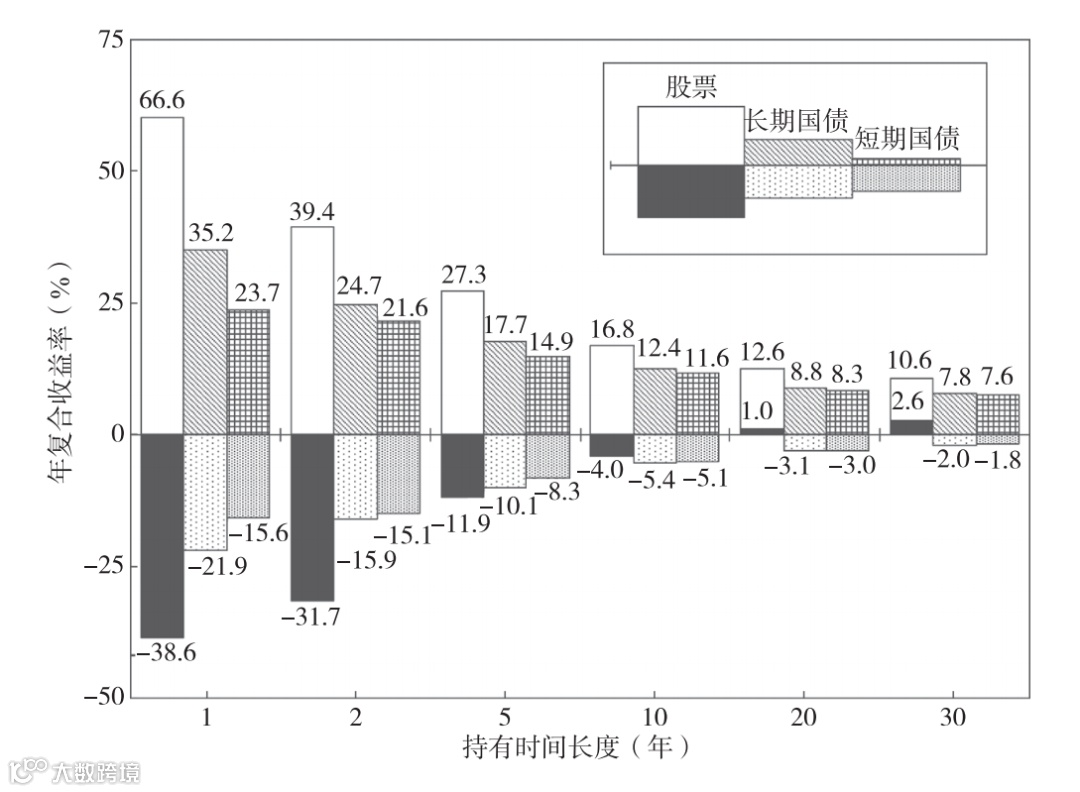 从图中可以看出,如果持有的时间只有一两年,那么毫无疑问,股票的收益率将远低于国债的收益率(一年期股票最小收益率为-38.6%,长期国债为-21.9%),而当持有时间延长至5年时,虽然股票的最低收益率仍然要更低(-11.9%),但已经非常接近于国债的最低收益率(-10.1%),同时,股票的最高收益率远高于国债的最高收益率(27.3%对17.7%)。当持有时间延长至10年时,股票的最低收益率已经更高;当持有时间延长至20年时,我们惊讶地发现:股票竟然将始终保持正的收益率!事实上,纵观200多年的股市发展史,只要持有时间超过17年,股票的历史收益率便从未出现过负数!