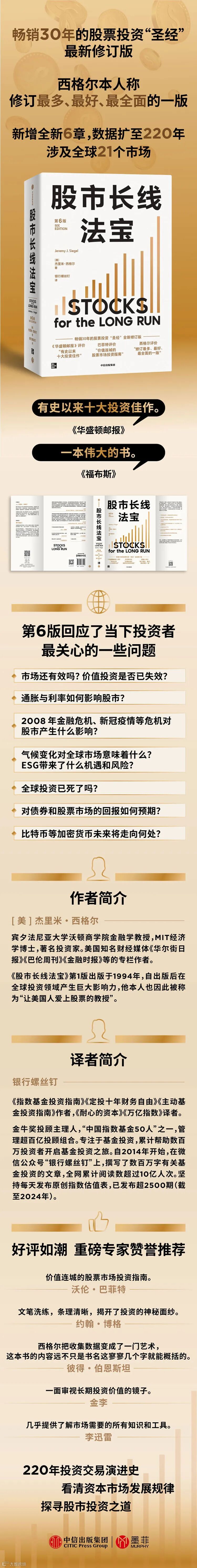 将近30年前,第1版《股市长线法宝》问世,之后,这本书就一直深受读者喜爱,我对此深感荣幸。第6版,是迄今为止修订最多的一个版本,增加了整整6个章节的内容,包括因子或风格投资法、有效市场假说、价值投资的未来、ESG(环境、社会和公司治理)、新冠疫情,以及大量关于通货膨胀和利率对股价会产生什么影响的探讨。其他章节也做了更多的扩展,比如首次分析了房地产的收益率情况、最优的股债配置方式、全球市值最大的公司命运如何、比特币等加密货币的未来、明星基金经理是否能持续战胜市场等。并且,几乎所有的数据都更新到了2021年。