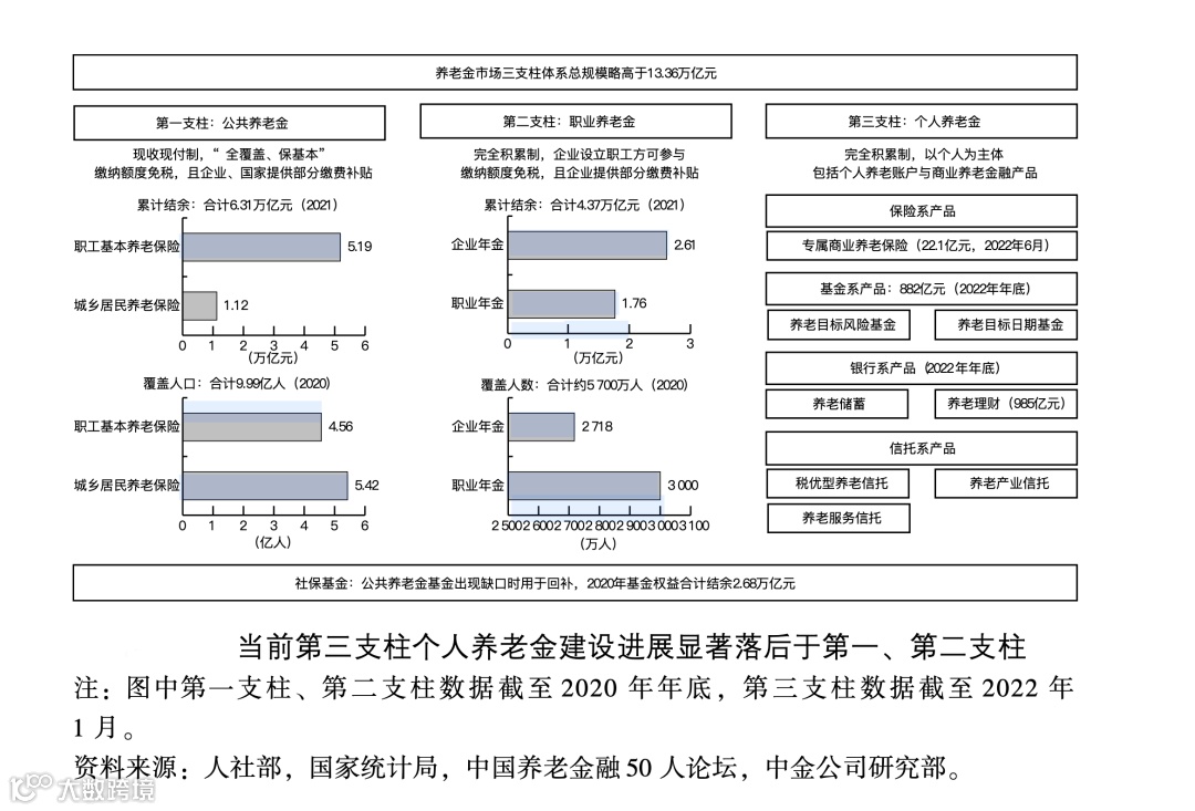 第三支柱个人养老金规模与覆盖范围有限。当前我国个人养老金账户制度出台不久,第三支柱市场主要由各类商业养老金融产品构成,目前规模较为有限。