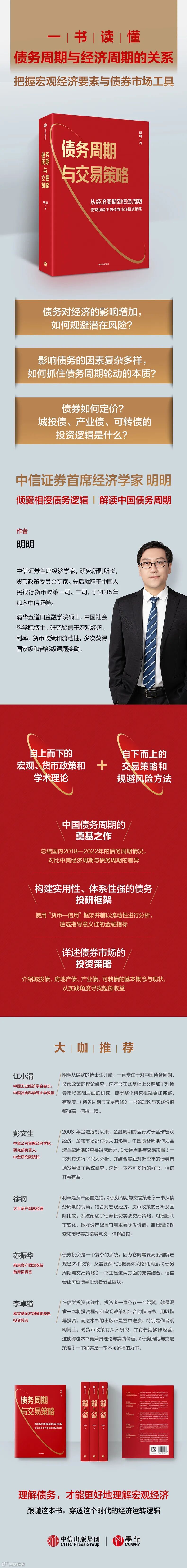 最后,我想说写书确实是一个漫长、艰苦和孤独的过程。我从货币政策三部曲开始(其中的第一本再版),到现在写完第五本书,大概花了十年的时间。回想起来感触良多,自己的人生、事业和心境都发生了很大变化。但我想,一个是坚持写书和研究没有变,另一个是一路上有很多志同道合的朋友和同事的陪伴没有变。在本书的写作过程中,中信出版社的张巧云、姜艺萍和许志老师给了我极大的帮助,她们的专业和兢兢业业的付出是本书能够顺利出版的最大力量。在本书的写作过程中,我在中信证券的同事,李晗、周成华、彭阳、秦楚媛、丘远航、徐烨烽、史雨洁、王凎、王楠茜、赵云鹏、周昀锋、赵诣、李天雄、来正杰、孙毓铭都参与了写作,他们都是非常优秀的年轻人,也是中国金融市场的未来。当然,最重要的是有各位读者的陪伴。记得曾经有一位素未谋面的读者给我发微信,说想要我的签名,而且一定要在他手里的那本书上签,当他把书快递给我的时候,我发现上面密密麻麻做满了笔记和批注,当时我真的非常感动,一切写作时的辛苦和孤独跟这个比起来都不算什么。正是有你们的陪伴,让我一路走来虽然很辛苦,但内心是充实的。未来的路还很远,我会一直写下去,也希望各位朋友都平安、顺意,我们总能在生活中、市场中、书中相见。