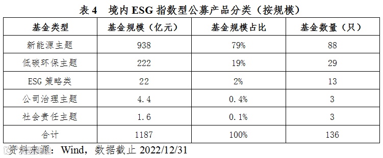 截至2022年12月31日,境内市场中共有136只泛ESG主题指数型公募基金,存续规模1187亿元,以新能源汽车、光伏等为主。相比之下,跟踪ESG策略、ESG优选指数的基金规模较小,目前成立的ESG策略类指数基金仅13只,规模均不超过10亿元,规模占比仅为2%。
