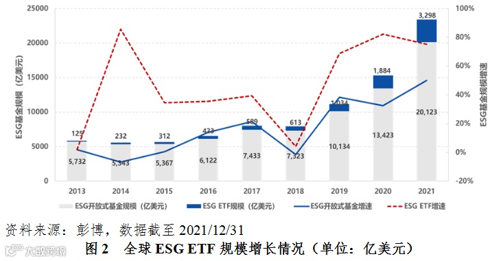 过去几年ESG投资规模快速膨胀。全球可持续投资联盟(GSIA)报告显示,ESG整合策略取代负面剔除策略成为全球范围内采用最多的投资策略。ESG ETF作为参与ESG投资重要工具,受到投资者广泛青睐。根据彭博数据统计,截至2021年年底,全球ESG ETF资产规模达到3298亿美元,同比增长92%。欧洲仍是全球ESG ETF增长引擎,2021年ETF市场超过50%的资金流入可持续投资领域。美国ESG ETF紧随其后,在SmartBeta型ESG ETF中,2020年来新发产品数量占比近半。