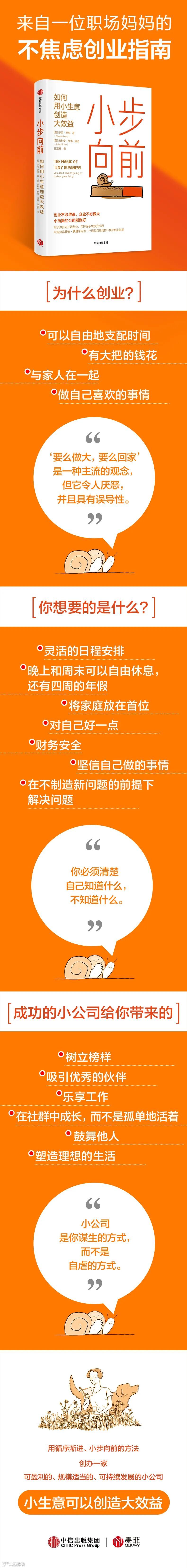 《小步向前》这本书包含了我学到的所有经验教训以及我想分享的关于小公司的看法与建议,它们经过了时间的检验。有了这些提醒,你能在创业之旅中更加顺利地前行。