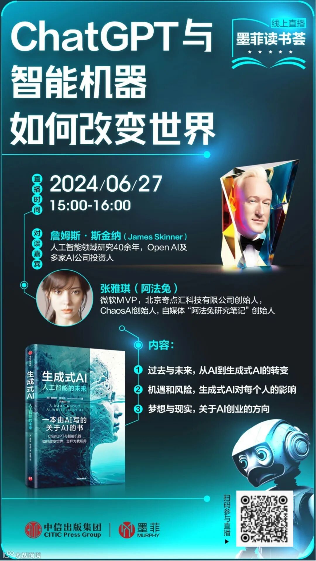 6月27日,我们特邀《生成式AI:人工智能的未来》作者詹姆斯·斯金纳与译者张雅琪(阿法兔)共探ChatGPT与智能机器如何改变世界。(欢迎扫码预约)