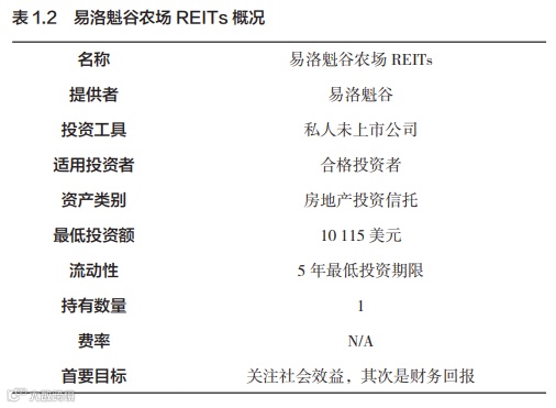 易洛魁谷是一种更容易进行的影响力投资,因为创始人努力使普通投资者也能投资于他们的公司。他们在 2018 年将公司转换为私人 REITs(房地产投资信托基金),以便让合格投资者参与。净资产超过 100 万美元或年收入超过 20 万美元,或者只要投资不超过年收入或净资产的 10%,便可以参与该基金的投资(见表 1.2)。