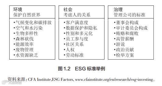 数据和研究公司,如彭博、MSCI 和 Sustainalytics,收集和发布了几十个 ESG 标准的数据。这些标准如图 1.2 所示。