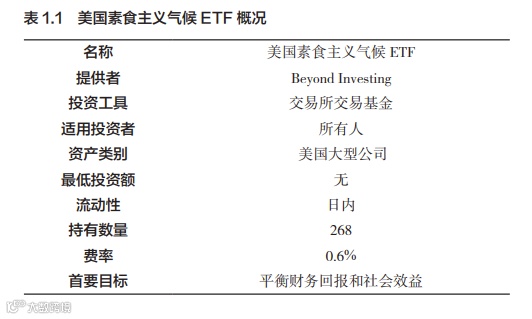 想理解 SRI 策略,美国素食主义气候 ETF(US Vegan Climate ETF)是一个很好的例子(见表 1.1),因为它在争取市场回报和 匹配素食主义者、动物保护者的价值观取得了平衡。