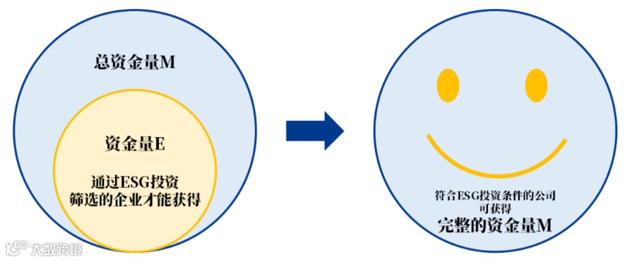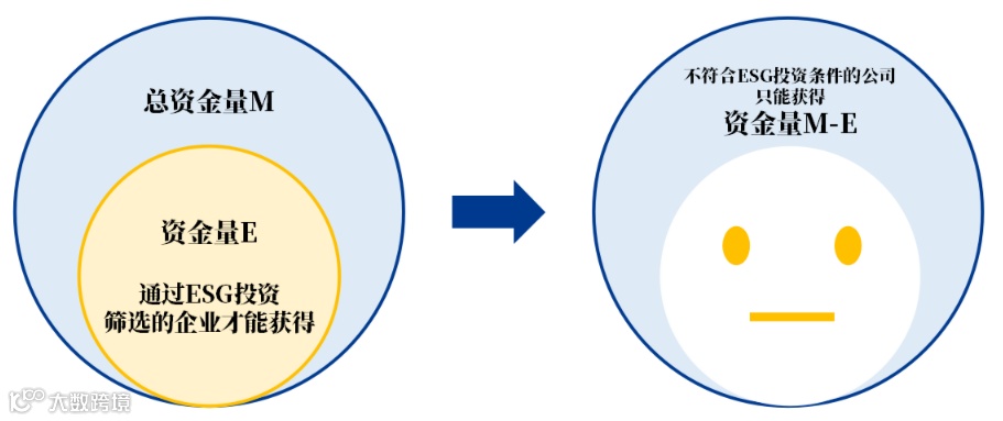 我们再用一个简单的公式来理解ESG投资的社会影响。假如有一笔钱M可供上市公司使用,而E是M的一部分,只有通过ESG投资筛选的企业才能获得完整的M资金,而被淘汰的企业只能获得M-E的资金。这就是ESG投资创造社会回报的一种方式,即为更负责、更善良的好公司提供更好的融资环境。个人投资者也可以通过ESG基金间接“用钱投票,改变世界”。