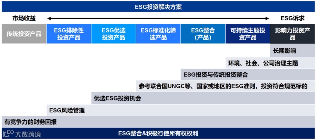 刘一锋:《可持续投资》也给出了制定可持续投资计划的五部曲:①设定目标和风险预算;②资产配置;③选择产品;④监控与再平衡;⑤回顾计划。具体到如何挑选基金,投资者可以根据自己对ESG策略的偏好选择相应的产品。以下这个光谱也总结了不同策略的区别,越往左越接近传统的投资,右侧则更注重社会和环境影响力。