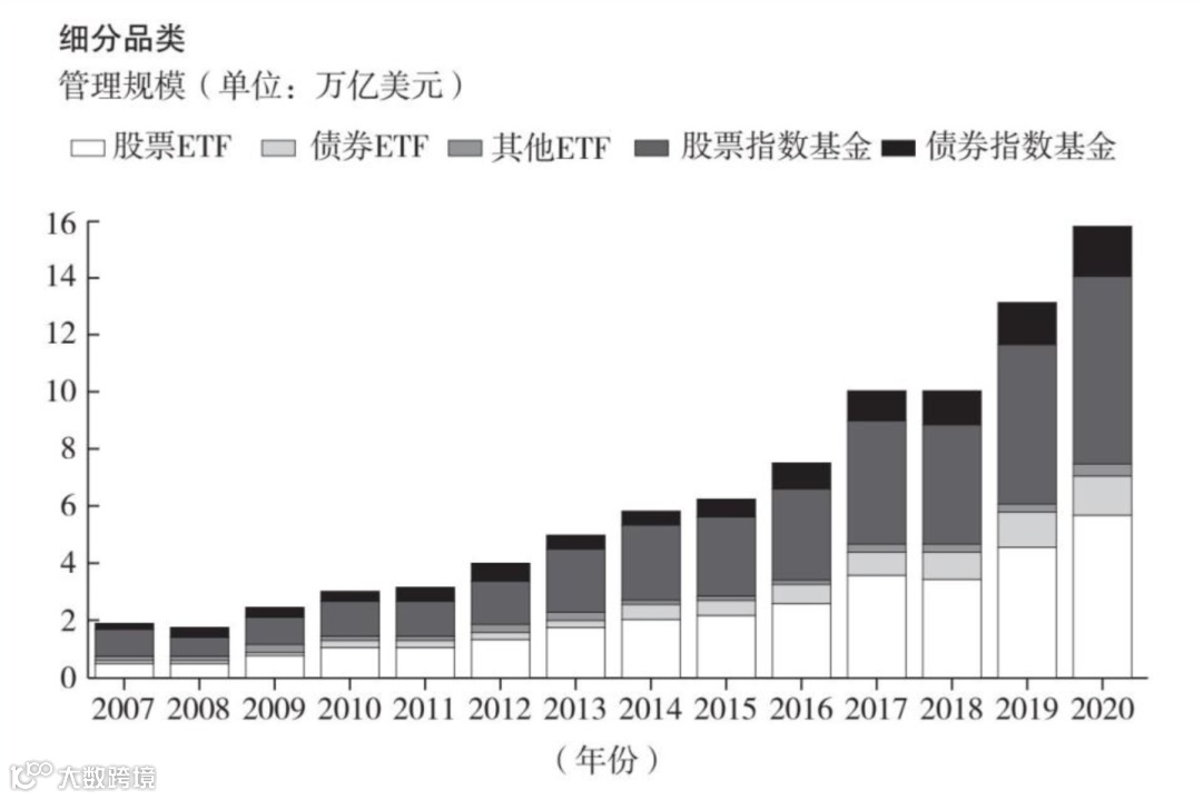 美国公募指数基金细分品类。迄今为止,股票指数基金是规模最大的一类,但债券指数基金的规模将在接下来的 10 年里再上一个台阶。图片来自:《万亿指数》。