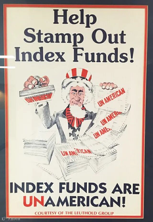 指数基金的诞生遭到主流金融业的激烈批评。当时一张印着山姆大叔的海报呼吁:“来一起消灭指数基金吧,指数基金是非美国的!”1975 年,华尔街巨头摩根大通的两位员工警告:“证券市场整个资本配置的作用将被扰乱,只有那些被纳入指数的股票才有上涨的可能。”