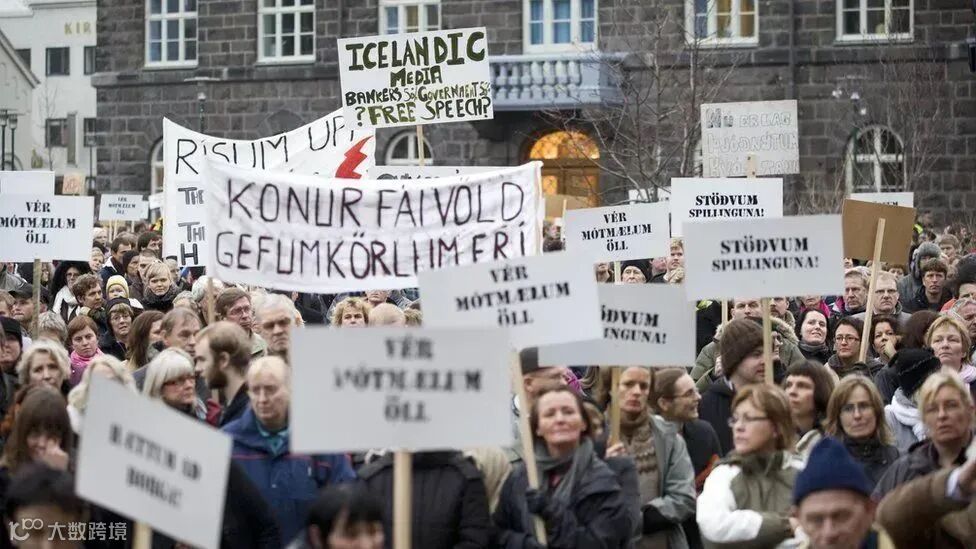 ▎ 2008年金融危机时,冰岛游行集会的人群。图源:Getty Images